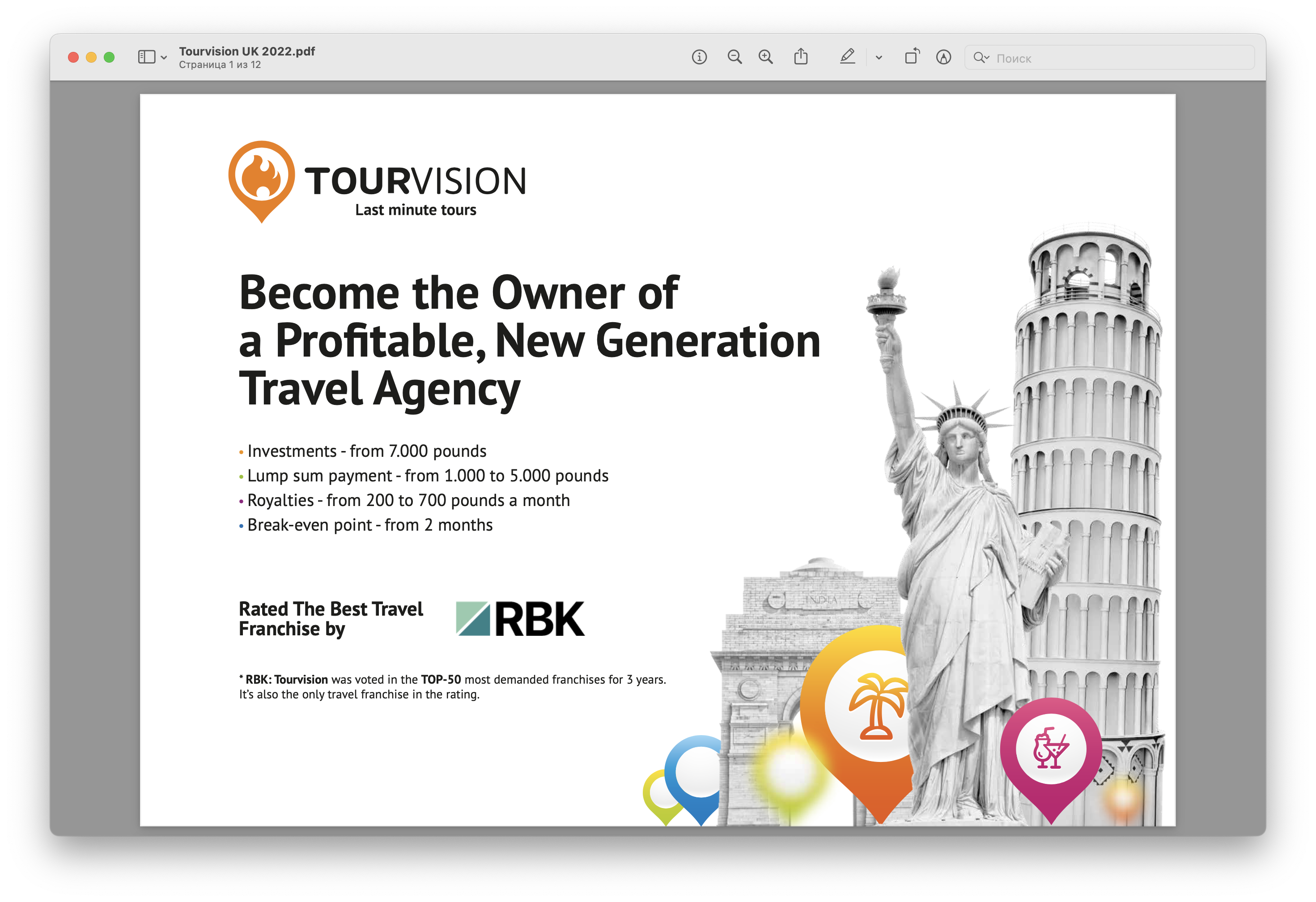 I would like to share my experience with the Tourvision franchise. I’ve been working in the city of Tomsk under the Tourvision name for a while now. Prior to it, I studied the entire market of tourist franchises, and I realized that there were several types of them: